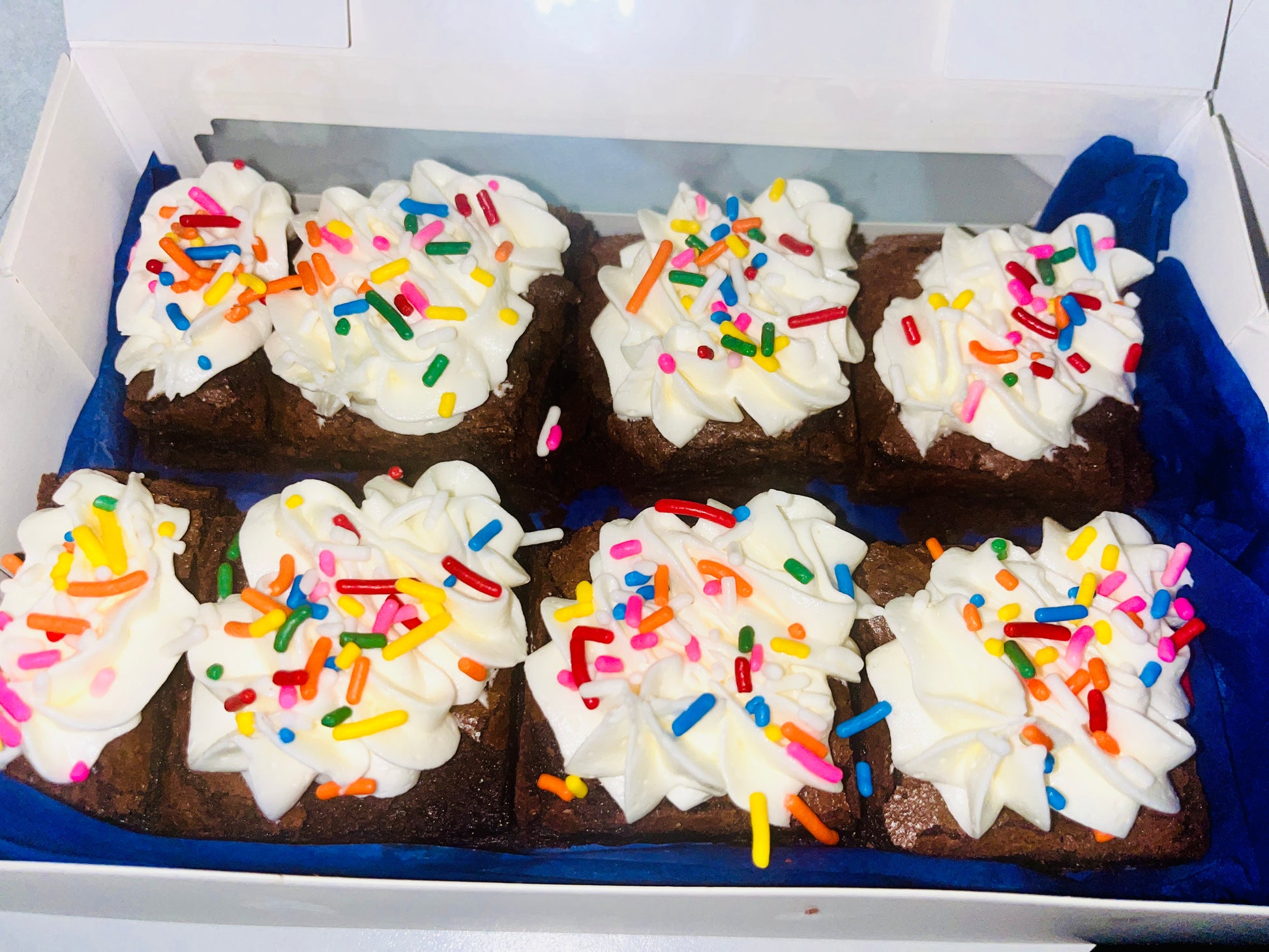 Get 9 pieces of brownies with classic vanilla frosting sprinkles.